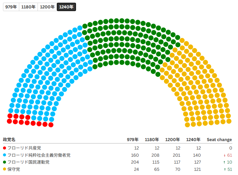 1240年4月、ラ・フローリド共和国において第四回立法議会議員選挙が実施され、各党の獲得議席が確定した。