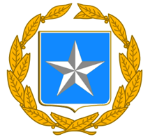 水色の盾形の紋の中心には「自由」を表す白星が描かれており、周りの月桂樹の枝は「栄光」を象徴している。